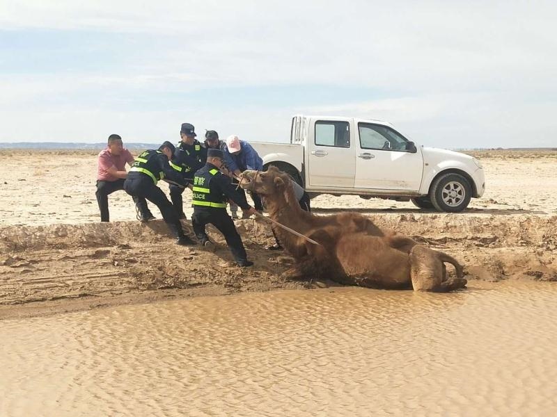 無獨(dú)有偶。當(dāng)日下午,阿拉善左旗蘇宏圖邊境派出所也接到群眾報(bào)警:稱其一峰駱駝陷入泥潭無法脫身,請求救助。民警趕到現(xiàn)場后發(fā)現(xiàn)這是一峰懷孕母駝,在飲水時(shí)不慎滑入泥潭,由于浸泡許久,已經(jīng)無法站立。民警當(dāng)即采取措施,在避免肚子受傷害的前提下,將兩條繩子分別固定在駱駝前肢與后肢,再利用人力拖拽,經(jīng)過2個小時(shí)的救援,成功將母駝救出。(牛鑫 梁鎮(zhèn) 于鶴偉)