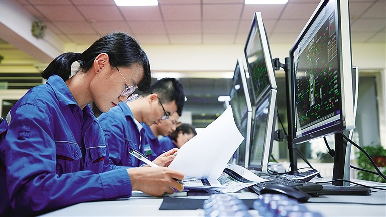 企業(yè)中控室內(nèi),技術(shù)人員正在對設(shè)備運行情況進(jìn)行監(jiān)控。趙小麗攝