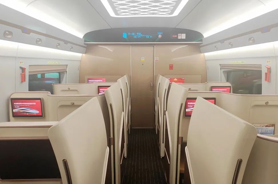 在空間布局方面,CR400BF-GS型動(dòng)車組通過(guò)設(shè)備小型化、集成化的措施,對(duì)車廂內(nèi)的整體平面布局進(jìn)行了優(yōu)化。車端占用空間得以縮小,客室空間相應(yīng)增大,列車定員由576人增至619人,顯著提高了動(dòng)車組列車的載客能力。