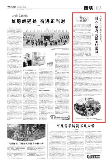2025年12月2日,《中國(guó)民族報(bào)》第3版刊發(fā)題為《內(nèi)蒙古達(dá)拉特旗工業(yè)街道:“同心”聚力,共建美好家園》的文章,報(bào)道了內(nèi)蒙古達(dá)拉特旗工業(yè)街道以“同心共建、同心共學(xué)、同心共事、同心共樂(lè)”的“四心四共”工作法賦能基層治理。打造“同心向暖·花開(kāi)工業(yè)”民族工作品牌,將民族團(tuán)結(jié)融入基層治理各環(huán)節(jié),奏響了開(kāi)放包容、融榮共居的和諧樂(lè)章。