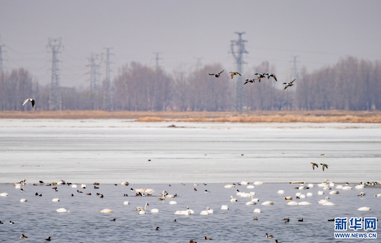 在土默特左旗海流水庫冰面上,候鳥在悠閑覓食。新華網(wǎng)發(fā)(陽光 攝)