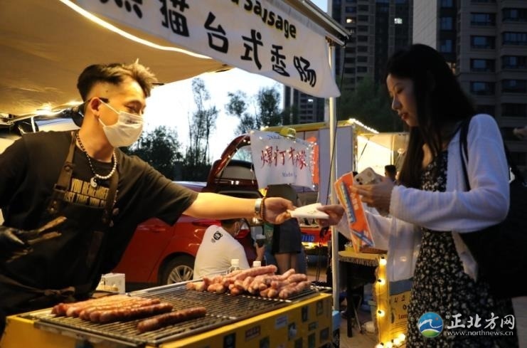人間煙火氣,最撫凡人心。雖然已是21時許,但是后備廂集市依然人頭攢動,熱鬧非凡,叫賣聲不絕于耳。一家烤腸攤位前,攤主郭浩楠一邊招呼食客,一邊拿著夾子不緊不慢地翻動著烤架上的烤腸,烤好后拿竹簽一穿,伴著滋滋作響的聲音,紅光透亮的烤腸瞬間香氣四溢?!耙呀?jīng)參加了好幾場了,一晚上能售出近百根烤腸,不過我的初衷不是為了賺錢,就是想把自己鐘情的美食分享給大家。”郭浩楠說。