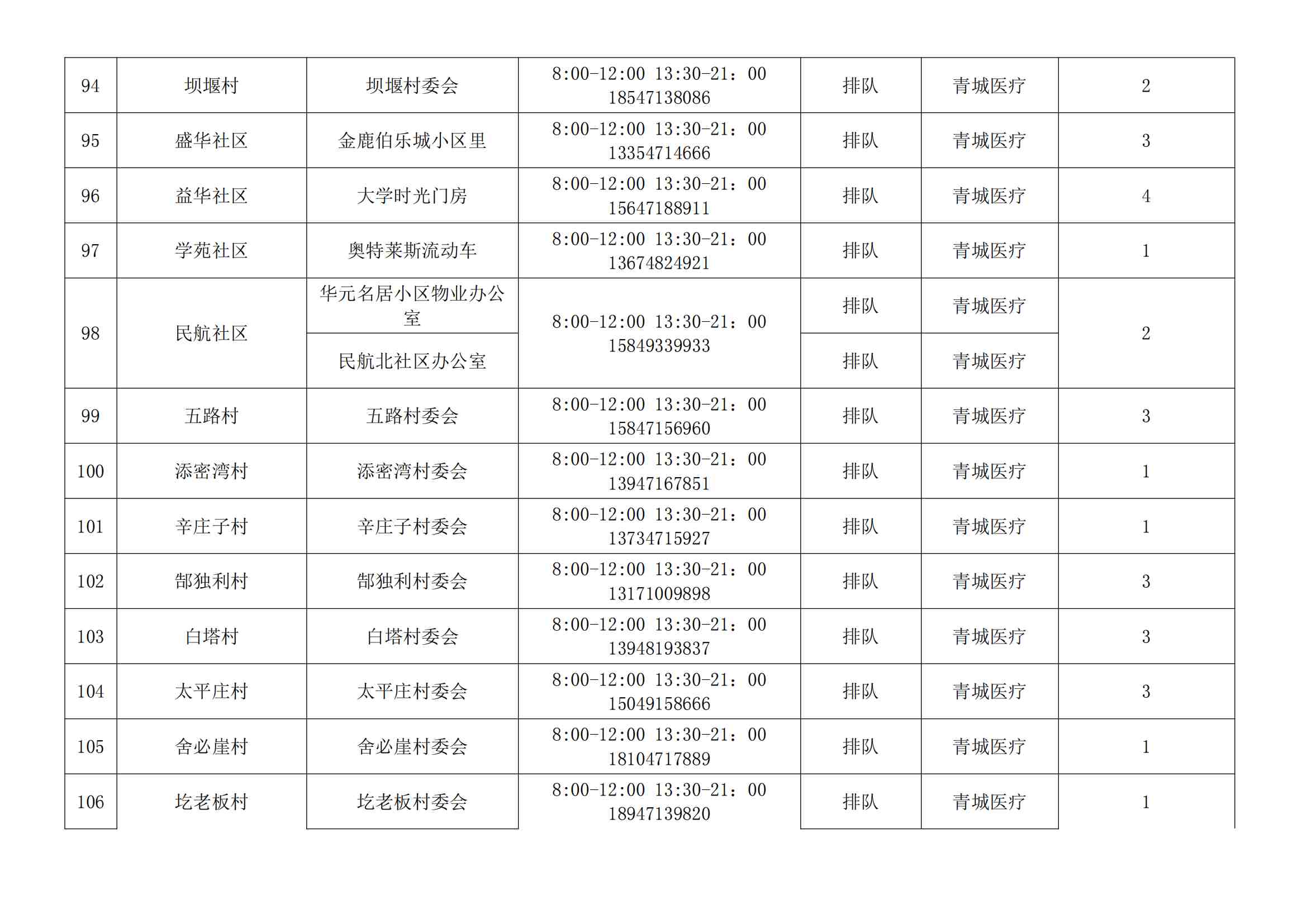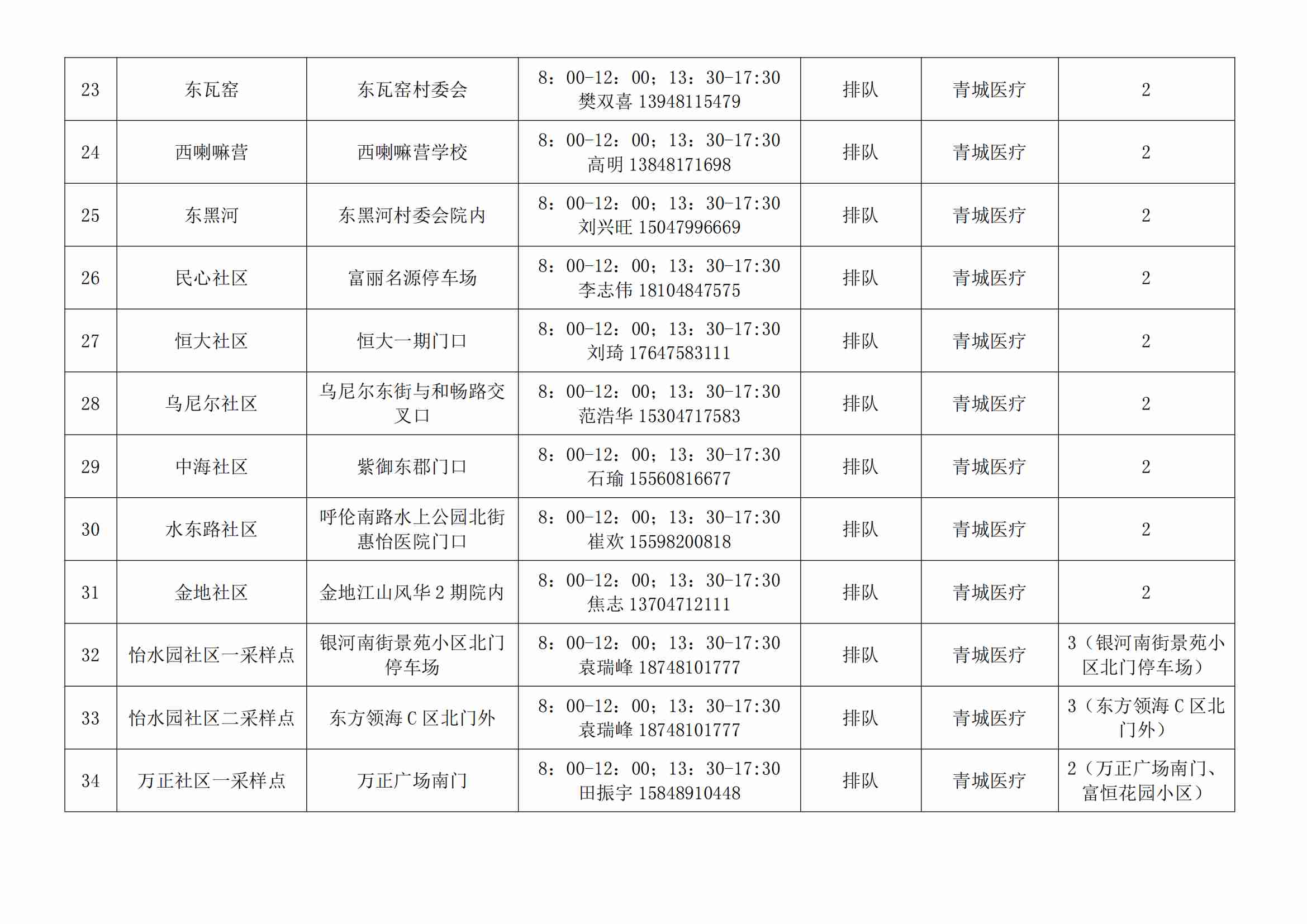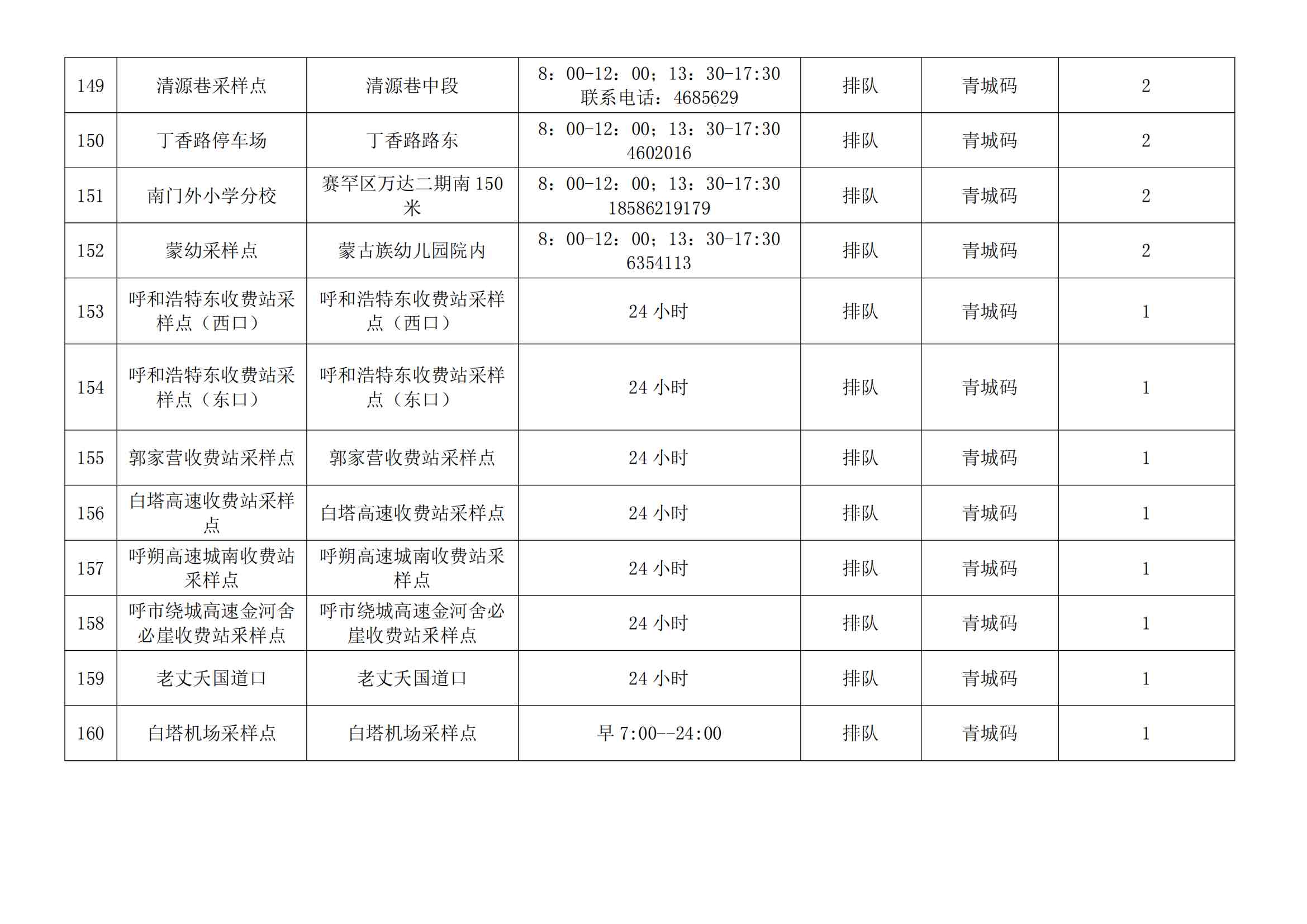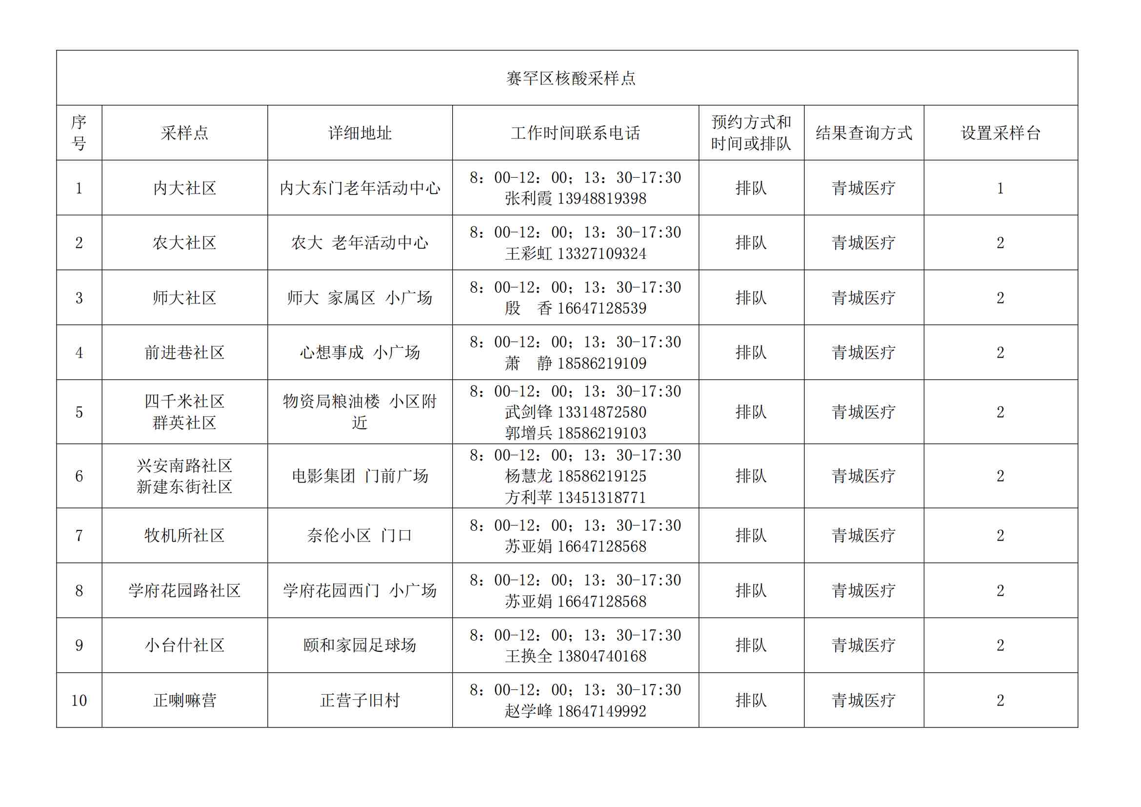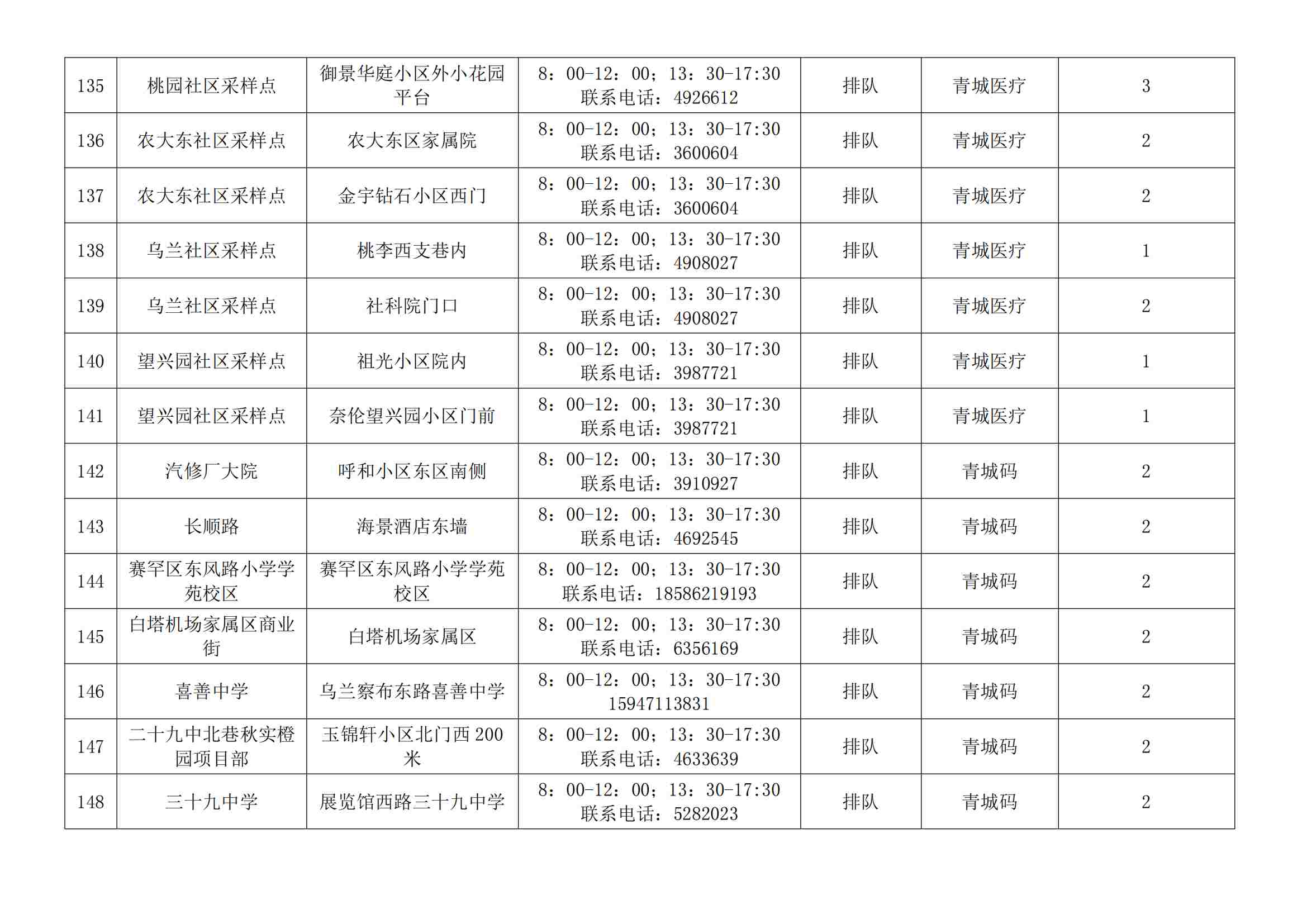 根據(jù)全市核酸檢測(cè)政策的調(diào)整,為滿足市民就醫(yī)、出行、工作等核酸檢測(cè)需求,賽罕區(qū)開(kāi)放160個(gè)便民核酸采樣點(diǎn)(詳見(jiàn)附表),廣大市民可就近選擇,核酸結(jié)果從青城碼查詢。