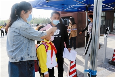 “等了這么久,終于可以和同學們說句:早上好。”6月2日,早上7點剛過,通遼新城第一中學小學部二年一班的班主任崔老師早早的在校門口,迎接班里的小朋友們。記者在校門口看到,此時,小學部二、三年級的小朋友已經(jīng)陸續(xù)入校了,顯然,“萌娃”們已經(jīng)被校門口的層層關(guān)卡震撼到了,幸好,在眾多老師的幫助和指引下順利進入了校門。進入了校門后,還有一道重要關(guān)卡,測量體溫,習慣了伸出手臂來測量體溫的“萌娃”們,對著紅外線測溫儀卻不知所措了,有的對著測溫儀伸出了手臂、有的對著測溫儀行禮,著實“萌”翻了現(xiàn)場所有人。“崔老師,我們都想你了?!币姷綆孜恍∨笥岩獪惖礁皟海蘩蠋熈⒖烫嵝淹瑢W們:我也很想念你們,但是我們要保持“一米”的距離,快去教室吧!小朋友們被“殘忍”拒絕,很是失落。