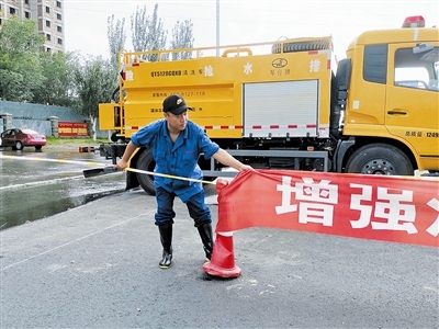 在這之前,通遼市排水管理處已啟動(dòng)應(yīng)急預(yù)案,搶險(xiǎn)人員及應(yīng)急搶險(xiǎn)車輛陸續(xù)就位。負(fù)責(zé)明仁立交橋排水搶險(xiǎn)的第2小組的4名成員兵分兩路,需要?jiǎng)裢藮|、西兩側(cè)準(zhǔn)備過橋的汽車司機(jī)和行人,以及排布車輛、施拉警界線……橋西邊,污水管道維護(hù)隊(duì)車隊(duì)隊(duì)長張?jiān)僦沁吤χ掷锏幕顑海呁ㄟ^對(duì)講機(jī)呼叫副隊(duì)長盛博,催促他趕緊向過往的車輛及行人喊話,提醒大家橋下水深不能通行。此時(shí),盛博已駕車由西向東行至立交橋南側(cè)的輔路上,雨水遮住了視線,雨刮器速度越來越快,他邊回應(yīng)張?jiān)僦牵叿怕囁傧蛉藗兒霸挕?/p>