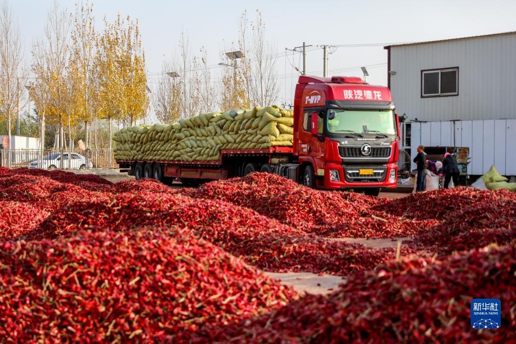 10月25日,在開(kāi)魯縣東風(fēng)鎮(zhèn)一家紅干椒銷(xiāo)售企業(yè)的廠(chǎng)區(qū)內(nèi),裝滿(mǎn)紅干椒的卡車(chē)準(zhǔn)備開(kāi)往四川。新華社記者 連振 攝