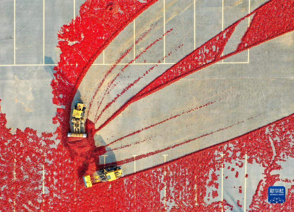 10月25日,在開(kāi)魯縣東風(fēng)鎮(zhèn),工作人員駕駛鏟車(chē)收獲晾曬好的紅干椒(無(wú)人機(jī)照片)。新華社記者 連振 攝