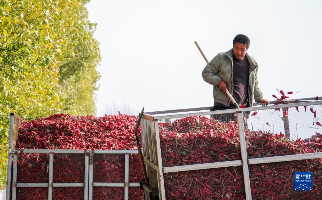 10月25日,在開(kāi)魯縣東風(fēng)鎮(zhèn)東方紅村,村民駕駛拖拉機(jī)運(yùn)輸紅干椒。新華社記者 連振 攝