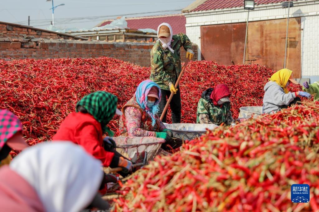 10月25日,在開(kāi)魯縣東風(fēng)鎮(zhèn)東方紅村,工作人員分揀處理紅干椒。新華社記者 連振 攝