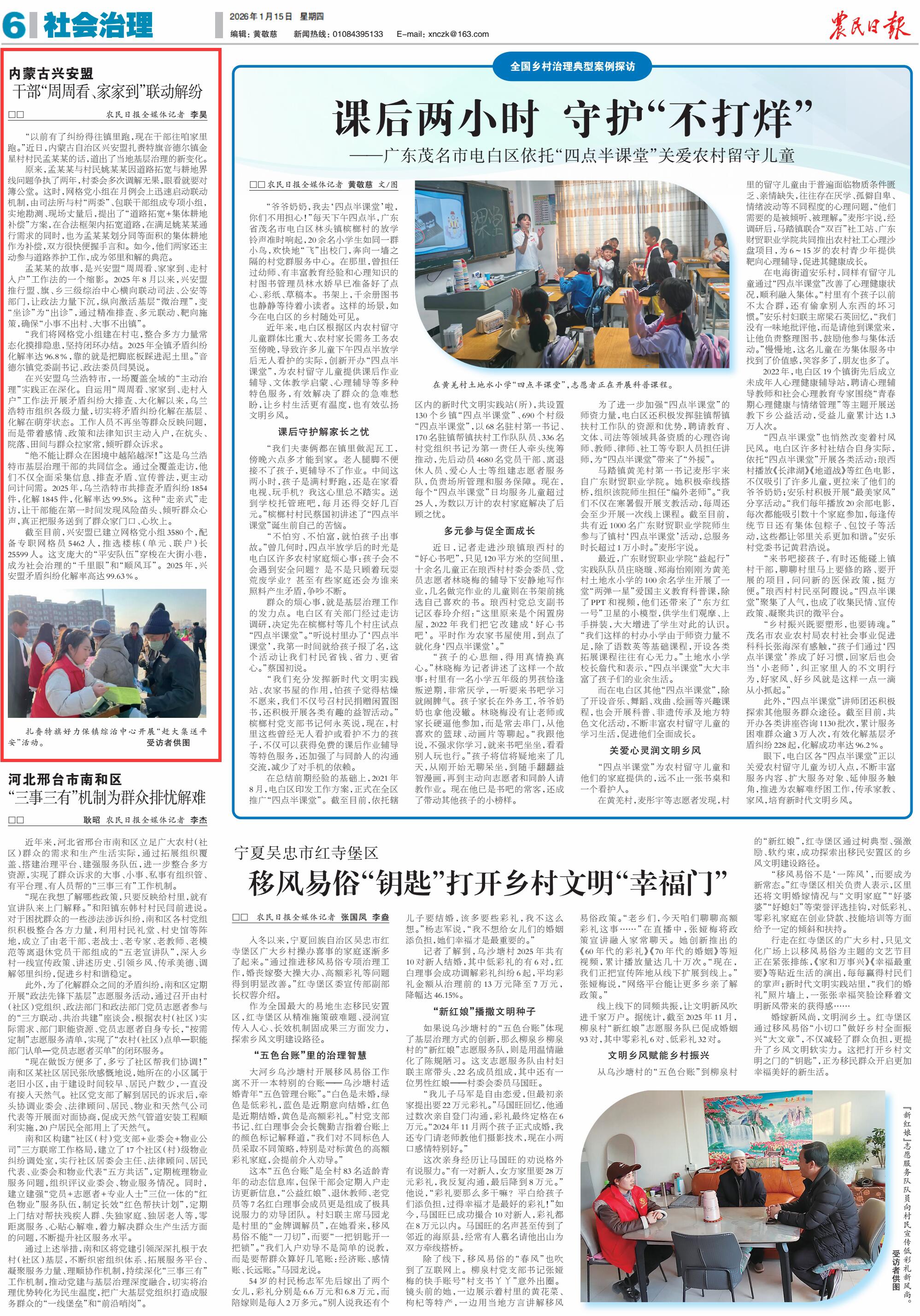 2026年1月15日,《農(nóng)民日報》第6版刊發(fā)題為《內(nèi)蒙古興安盟 干部“周周看、家家到”聯(lián)動解紛》的文章,報道了2025年8月以來,興安盟推行盟、旗、鄉(xiāng)三級綜治中心橫向聯(lián)動司法、公安等部門,讓政法力量下沉,縱向激活基層“微治理”,變“坐診”為“出診”,通過精準(zhǔn)排查、多元聯(lián)動、靶向施策,確保“小事不出村、大事不出鎮(zhèn)”。