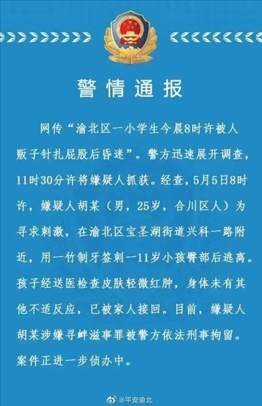 ·重慶警方通報“渝北一學(xué)生被人販子針扎后昏迷”:嫌疑人被依法刑事拘留。