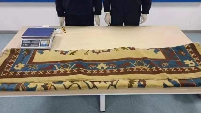 深圳郵局海關(guān)關(guān)員在對(duì)過(guò)境貨物開(kāi)展監(jiān)管時(shí)發(fā)現(xiàn),1票包裹機(jī)檢圖像可疑,隨即對(duì)其開(kāi)箱查驗(yàn)。查驗(yàn)發(fā)現(xiàn),該票包裹內(nèi)有一塊做工精致的地毯,編織到地毯內(nèi)的透明細(xì)塑料管中藏匿有細(xì)粉末一批,毛重11555.8克。經(jīng)現(xiàn)場(chǎng)試劑檢測(cè),判斷為冰毒。目前,海關(guān)緝私部門已介入調(diào)查處理。