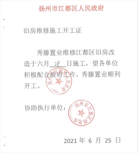 “搞定”西苑社區(qū)后,楊某軍偽造一份《揚州市江都區(qū)人民政府舊房維修施工開工證》,并加蓋“揚州市江都區(qū)人民政府 178962”“揚州市江都區(qū)規(guī)劃局”公章。周女士獲得該證后,立即組織顧先生進(jìn)場施工?!皸钅耻娮屛蚁葔|付材料款和人工費,后面等財政撥款就行。我就安排顧先生7月1日進(jìn)場施工?!?/p>