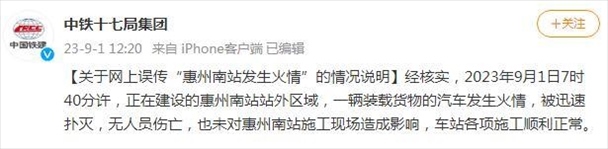 ·中鐵十七局集團(tuán)發(fā)布對(duì)“惠州南站發(fā)生火情”的說明:一輛裝載貨物的汽車發(fā)生火情,被迅速撲滅,未造成人員、財(cái)產(chǎn)傷亡。