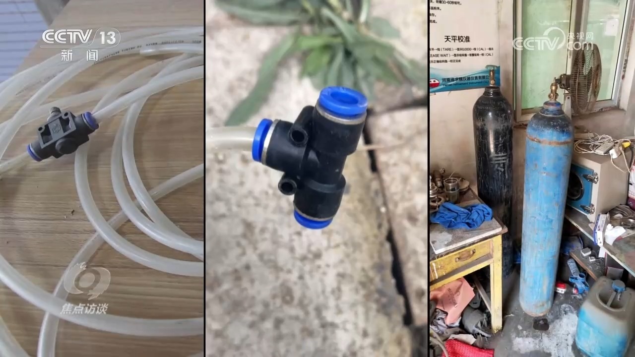 塑料軟管、三通管件、氮氣瓶,就是“環(huán)??萍脊尽钡娜藖斫o磚廠安裝的所謂“環(huán)保設(shè)備”,他們把氮氣接入采樣管線,稀釋采樣氣體,從而達(dá)到干擾在線監(jiān)測數(shù)據(jù)的目的。
