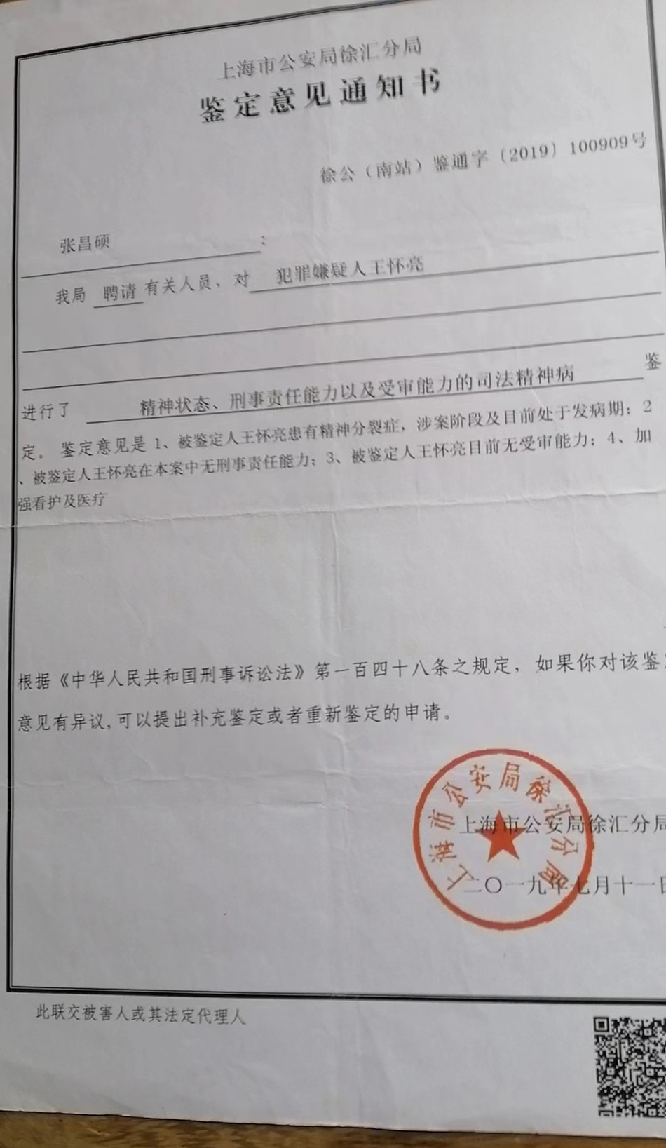 張宏銀回憶,他已經(jīng)不記得這起依法不負(fù)刑事責(zé)任的精神病人強(qiáng)制醫(yī)療程序案件開庭審理的具體時間,只記得是2019年下半年的一天上午,那天犯罪嫌疑人沒有到場,律師也沒有到場,檢察院的兩位人員出席了開庭。徐匯區(qū)法院當(dāng)庭做出判決:王懷亮被送往醫(yī)療機(jī)構(gòu)進(jìn)行強(qiáng)制醫(yī)療。2019年7月12日,張宏銀收到公安局的撤銷案件決定書。