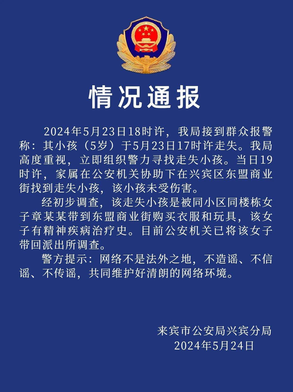 央視網(wǎng)消息:據(jù)“興賓公安”微信公眾號消息,廣西壯族自治區(qū)來賓市公安局興賓分局通報,2024年5月23日18時許,興賓分局接到群眾報警稱:其小孩(5歲)于5月23日17時許走失。興賓分局高度重視,立即組織警力尋找走失小孩。當(dāng)日19時許,家屬在公安機關(guān)協(xié)助下在興賓區(qū)東盟商業(yè)街找到走失小孩,該小孩未受傷害。