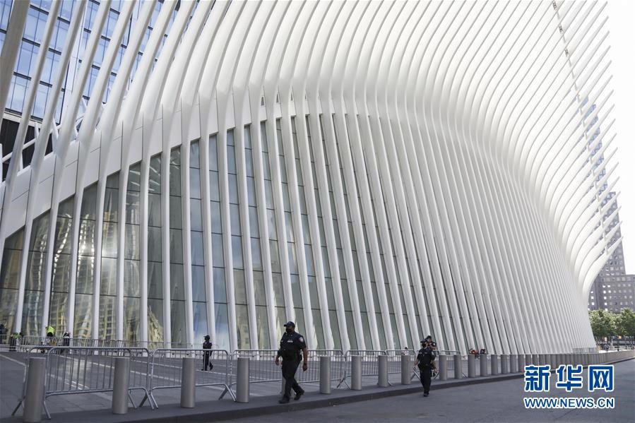 6月10日,警察在美國(guó)紐約世貿(mào)中心車(chē)站外戴著口罩巡邏。新華社記者王迎攝