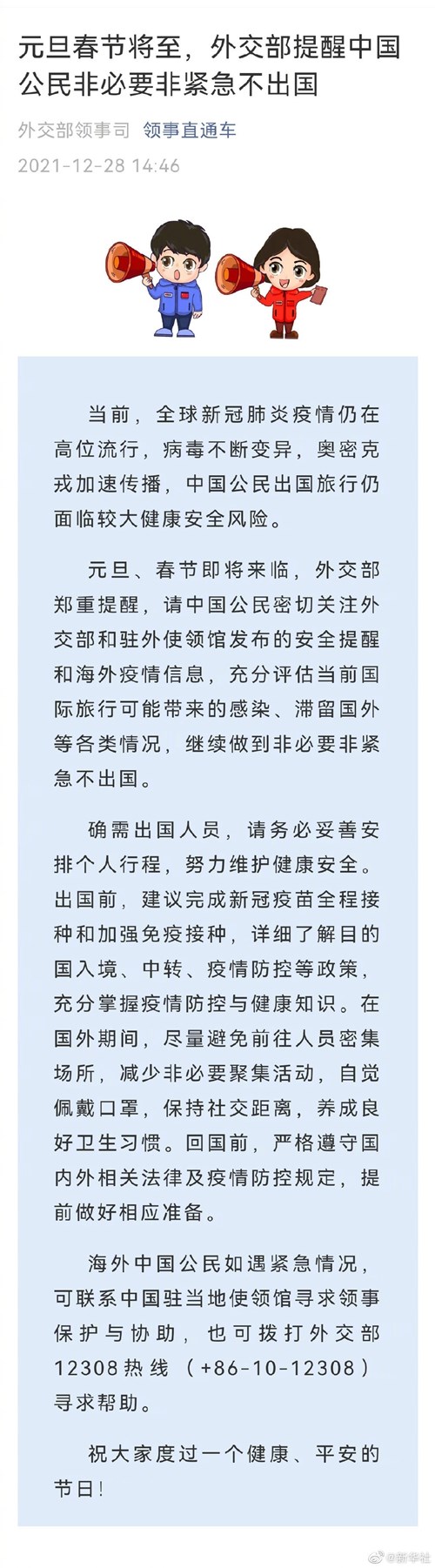 元旦、春節(jié)即將來臨,外交部鄭重提醒,請(qǐng)中國公民密切關(guān)注外交部和駐外使領(lǐng)館發(fā)布的安全提醒和海外疫情信息,充分評(píng)估當(dāng)前國際旅行可能帶來的感染、滯留國外等各類情況,繼續(xù)做到非必要非緊急不出國。
