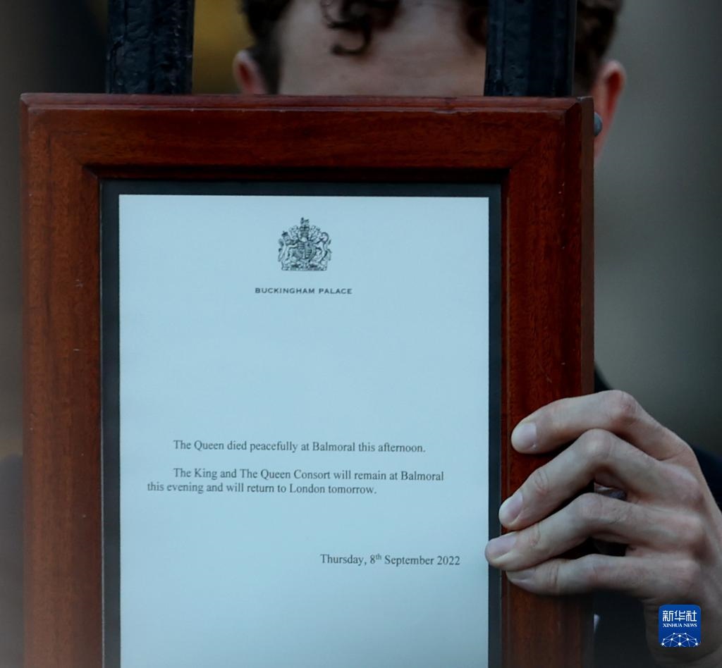 9月8日,在英國倫敦,工作人員將英國女王伊麗莎白二世去世的告示安放在白金漢宮大門上。新華社記者李穎攝