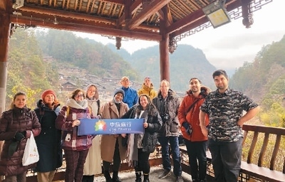 貴州省凱里市的郎德上寨被譽為“中國景觀村落”,圖為在華外國人到此游覽。 中旅旅行供圖