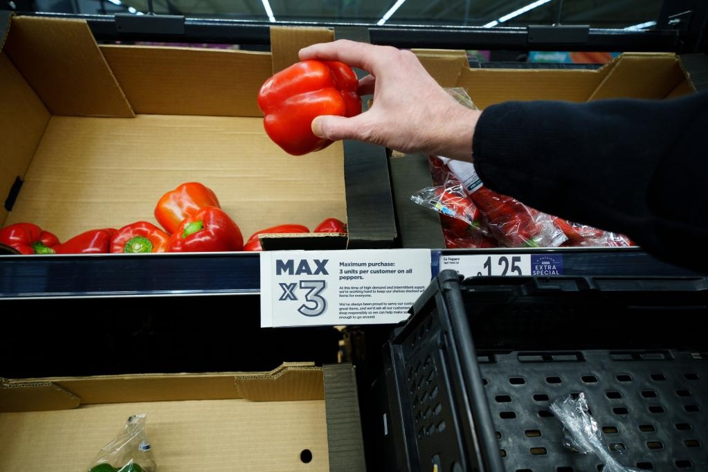 這是2月23日在英國曼徹斯特一家超市拍攝的蔬菜貨架上的限購?fù)ㄖ?。按照通知,每名顧客一次只能最多購買3個(gè)彩椒。新華社發(fā)(喬恩·休珀攝)