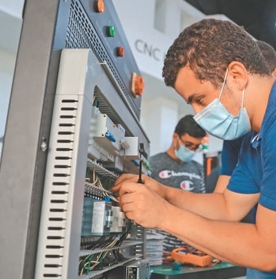 2022年8月16日,在位于埃及首都開(kāi)羅的艾因夏姆斯大學(xué)魯班工坊,學(xué)生正在學(xué)習(xí)電路連接。 新華社記者 隋先凱攝