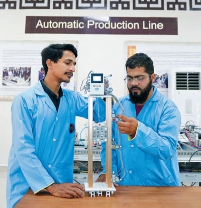 在巴基斯坦魯班工坊工業(yè)自動(dòng)化和機(jī)器人專(zhuān)業(yè)課堂上,學(xué)生模擬實(shí)踐電梯組裝運(yùn)行技術(shù)。 巴基斯坦魯班工坊供圖