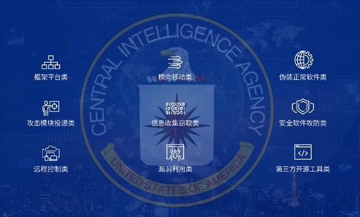 國家病毒應(yīng)急處理中心和360公司通過進一步技術(shù)分析發(fā)現(xiàn),盡管CIA的后門程序和攻擊組件大都以無實體文件的內(nèi)存駐留執(zhí)行的方式運行,這使得對相關(guān)樣本的發(fā)現(xiàn)和取證難度極大。即使這樣,聯(lián)合技術(shù)團隊還是成功找到了解決取證難題的有效方法,發(fā)現(xiàn)了CIA所使用的9個類別的攻擊武器,包括攻擊模塊投遞類、遠程控制類、信息收集竊取類、第三方開源工具類等。
