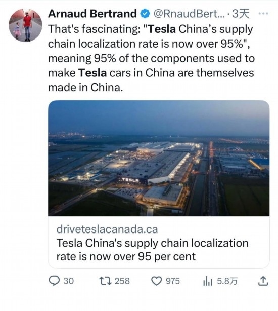 貝特朗還常為中國(guó)發(fā)展“點(diǎn)贊”。他在轉(zhuǎn)發(fā)特斯拉上海超級(jí)工廠新聞時(shí)由衷贊嘆:“真是太厲害了,這表示在中國(guó)生產(chǎn)特斯拉汽車所用的95%的零部件都是中國(guó)制造。”(參與記者:陳紹華、張曼;視頻:淡然、王沛;編輯:魯豫、王豐豐、杜逾舸、孫浩)