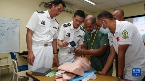 中國海軍“和平方舟”號醫(yī)院船派出醫(yī)療專家分隊赴東帝汶國立醫(yī)院進(jìn)行ACLS培訓(xùn),醫(yī)院船醫(yī)療專家為當(dāng)?shù)蒯t(yī)護(hù)人員進(jìn)行實操講解(9月5日攝)。新華社記者 黎云 攝