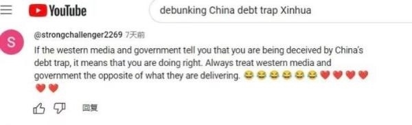 網(wǎng)友“強力挑戰(zhàn)者2269”直言:“如果西方政府和媒體告訴你,你陷入了中國的‘債務(wù)陷阱’,那證明你做對了。對待西方媒體和政府宣傳的信息,你得反著看。”