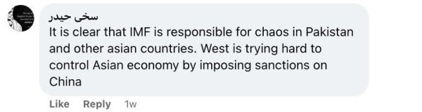 還有網(wǎng)友留言說:“國際貨幣基金組織對巴基斯坦和其他亞洲國家的混亂負有責任,這一點再清楚不過了。西方試圖通過制裁中國來控制亞洲經(jīng)濟?!?/p>