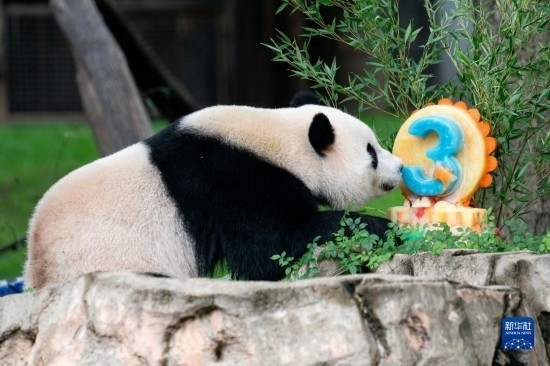 8月21日,大熊貓幼崽“小奇跡”在美國首都華盛頓史密森學(xué)會國家動物園享用生日蛋糕。新華社記者 劉杰 攝
