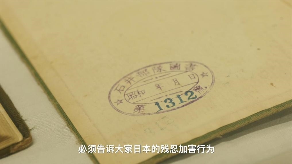 圖為飯?zhí)锸泻推狡砟铕^展廳內(nèi)展出的蓋有“石井部隊(duì)”印章的《人體解剖學(xué)》書籍內(nèi)頁。(視頻截圖)