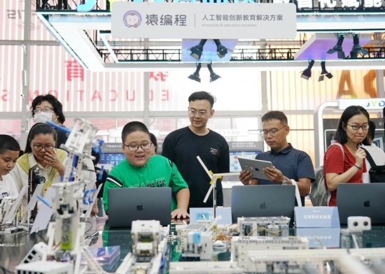 9月3日,在首鋼園教育服務(wù)專(zhuān)題展區(qū),小朋友在體驗(yàn)智能硬件編程作品。新華社記者 張晨霖 攝