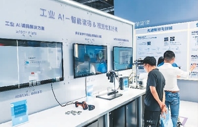 觀眾在英特爾展區(qū)的工業(yè)AI展臺(tái)參觀手持智能終端、視覺(jué)控制器等設(shè)備。