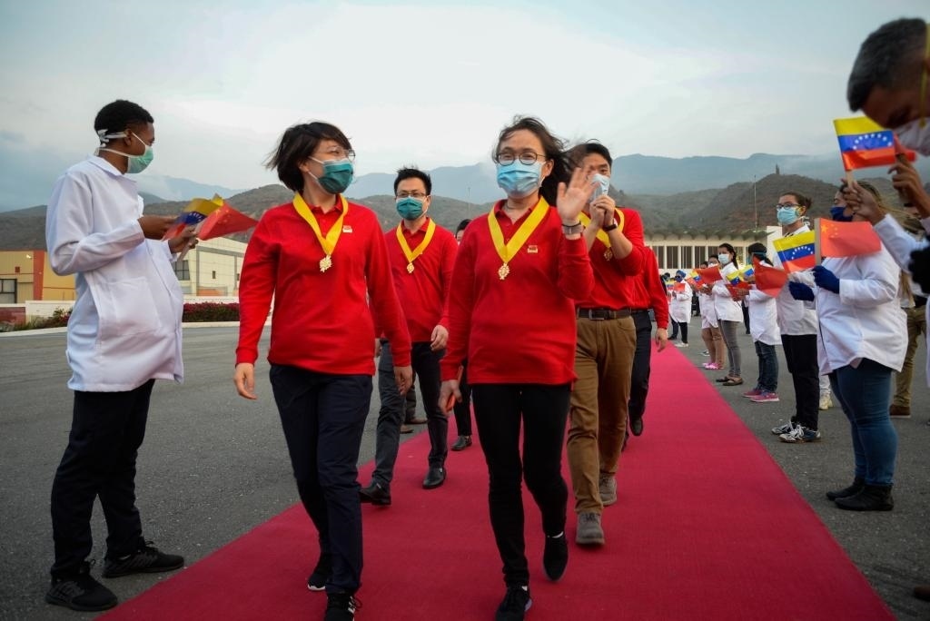 2020年4月11日,在委內(nèi)瑞拉首都加拉加斯,中國(guó)抗疫醫(yī)療專(zhuān)家組在授勛儀式結(jié)束后登機(jī)回國(guó)。新華社發(fā)(薩爾戈多攝)