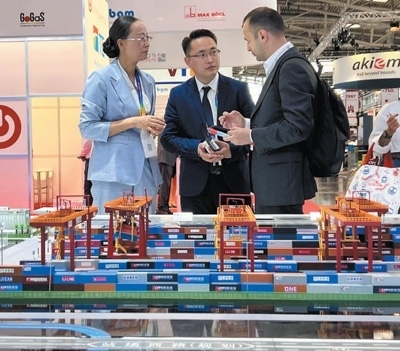在2023年慕尼黑國(guó)際物流博覽會(huì)上,工作人員在中鐵集裝箱運(yùn)輸有限公司展臺(tái)前向國(guó)外客戶介紹廣州國(guó)際港中歐班列站點(diǎn)設(shè)施。本報(bào)記者 李 強(qiáng)攝