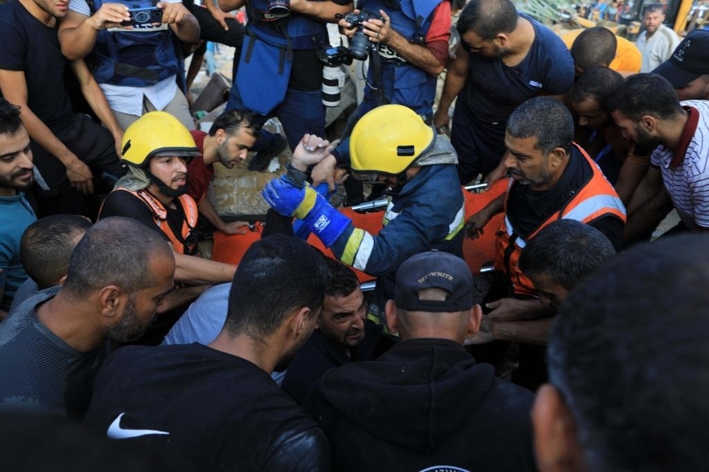10月16日,在加沙地帶南部城市汗尤尼斯,人們?cè)谠庖陨幸u擊后的建筑廢墟中救援傷者。新華社發(fā)(亞西爾·庫(kù)迪攝)