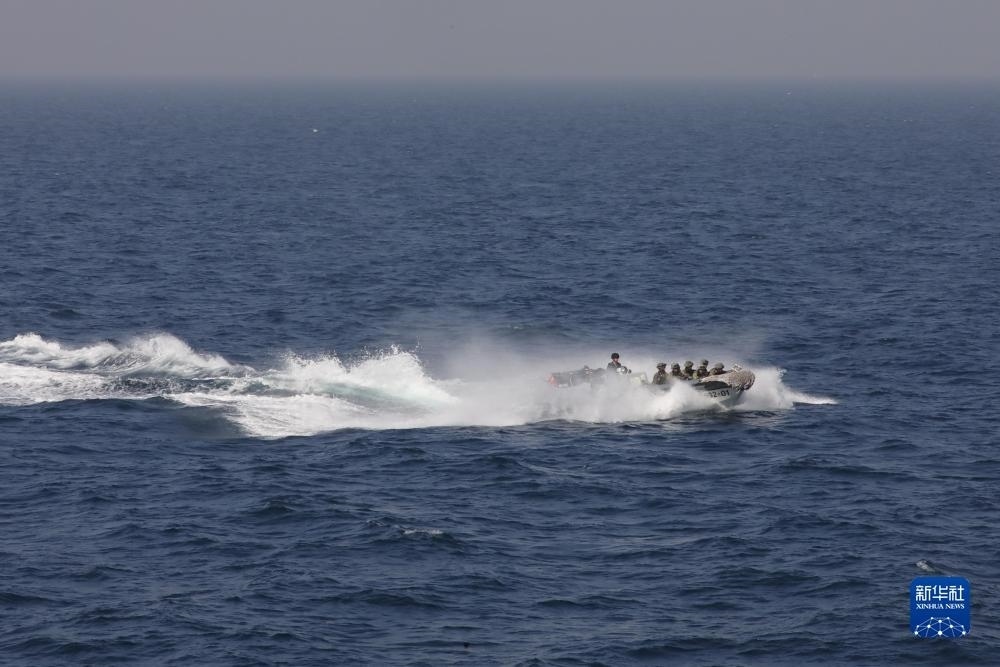 中巴“海洋衛(wèi)士-3”海上聯(lián)合演習在阿拉伯海北部??沼蚺e行,中國海軍荊州艦特戰(zhàn)隊員在臨檢拿捕演練中乘小艇前出(11月14日攝)。新華社發(fā)(姜霞攝)