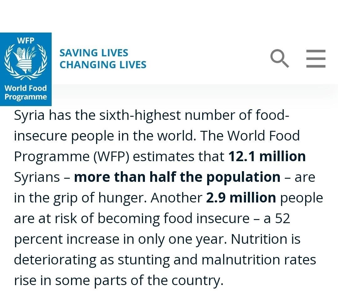 盡管敘政府仍保有部分農(nóng)田的控制權(quán),但西方制裁對金融和貿(mào)易的限制使得化肥、種子、農(nóng)藥、飼料、農(nóng)機零配件等無法進入敘利亞境內(nèi)。歷史上的敘利亞是小麥出口國,而如今的政府卻不得不使用非常寶貴的外匯來進口大量小麥,財政負擔(dān)因此而大大增加。即便如此,世界糧食計劃署的數(shù)據(jù)仍顯示,敘利亞境內(nèi)約有一半以上人口面臨糧食不安全,240萬人面臨著嚴重的營養(yǎng)危機。