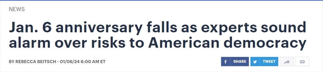 這項民調(diào)結(jié)果公布之時,正值“國會山騷亂”事件三周年之際,美國也迎來新的選舉年?!秶鴷綀蟆肪W(wǎng)站在6日的報道中再次提到,目前美國出現(xiàn)了一系列與民主狀況有關(guān)的令人不安的跡象。