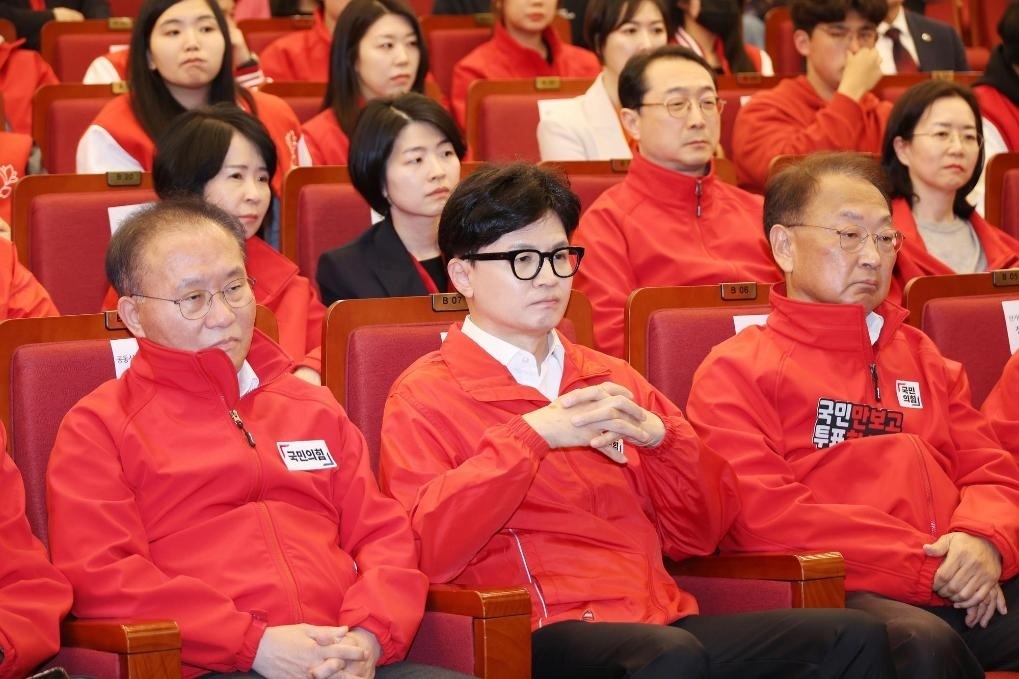 4月10日,在韓國首爾,國民力量黨領導人韓東勛(前排中)觀看出口民調(diào)。新華社/紐西斯通訊社