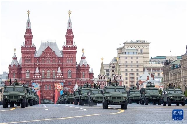 5月9日,在俄羅斯首都莫斯科,軍車編隊(duì)駛過紅場(chǎng)。新華社記者 曹陽 攝