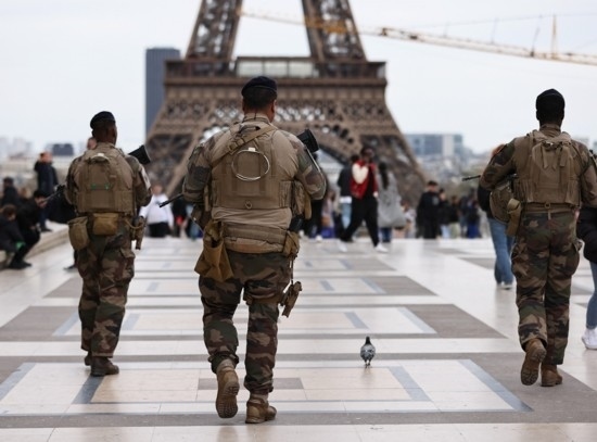 3月25日,法國士兵在巴黎特羅卡德羅廣場(chǎng)附近巡邏警戒。新華社記者高靜攝