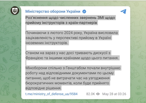 5月28日,烏克蘭國防部在Telegram上發(fā)文稱,到目前為止仍在就接受伙伴國教員一事,與法國和其他國家進行討論。