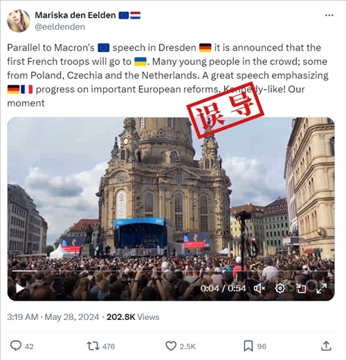 視頻顯示的內(nèi)容系馬克龍在演講開篇用德語對現(xiàn)場來賓進行問候,未提到法國軍隊。核查馬克龍在德累斯頓的演講內(nèi)容發(fā)現(xiàn),在近40分鐘的演講期間,馬克龍共有16次提到“烏克蘭”,但其中沒有內(nèi)容是與向烏克蘭派遣法國軍隊相關(guān)的。