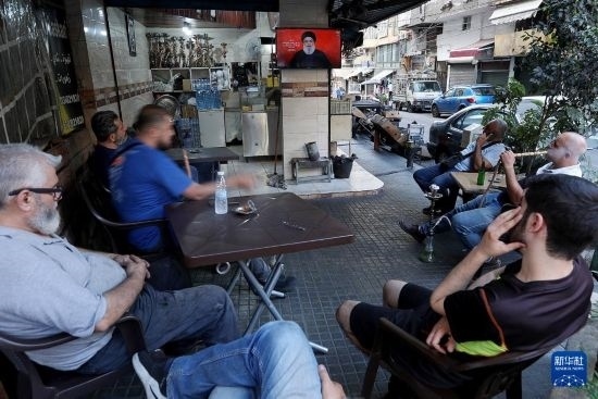 9月19日,在黎巴嫩貝魯特,人們收看真主黨領導人納斯魯拉發(fā)表電視講話。新華社發(fā)(比拉爾·賈維希攝)