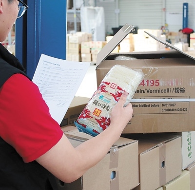 圖為東方超市員工在清點剛運抵貨運中心的龍口粉絲。作為中國最早與歐盟互認的地理標志產(chǎn)品之一,龍口粉絲一直深受德國顧客的青睞。